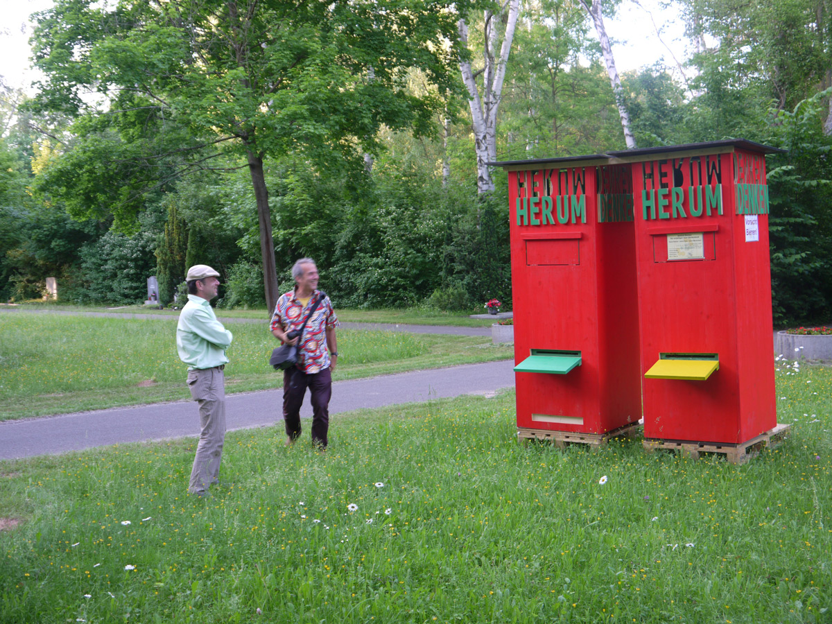Die einstigen Sammelboxen des Projektes sind nun am Ende des „Anders Handeln“-Prozesses mit Bienen besiedelt, sodass wir zusammen mit dem Imkermeister Herrn Bilder einen „Anders-Herum-Denken-Honig“ produzieren können. Bestellt werden kann der Honig unter Volkmann@dasPapiertheater.de. Die Bienenboxen stehen öffentlich im Friedhof in Fürth und wollen weitergehend zum „Anders Herum Denken“ anregen. Initiatoren: Johannes Volkmann Herr Binder, Friedhofsverwaltung Fürth |