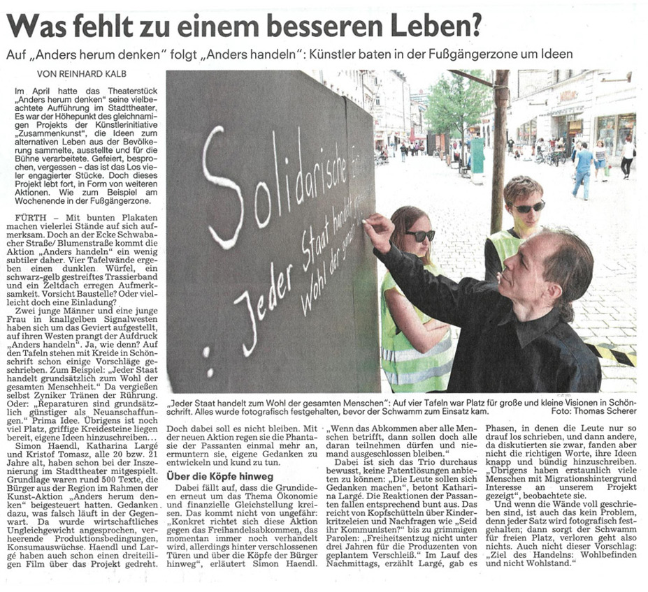 Zum Neujahr 2016 begann die Fa. Zusammenkunst mit dem Projektteil ANDERS HERUM DENKEN, parallel in den Städten Fürth und Nürnberg. Lesen Sie hier den Projektverlauf der Gesellschaftsinszenierung. Eine DVD über die entstandene Inszenierung ist auf Wunsch erhältlich, ebenso die Broschüre.