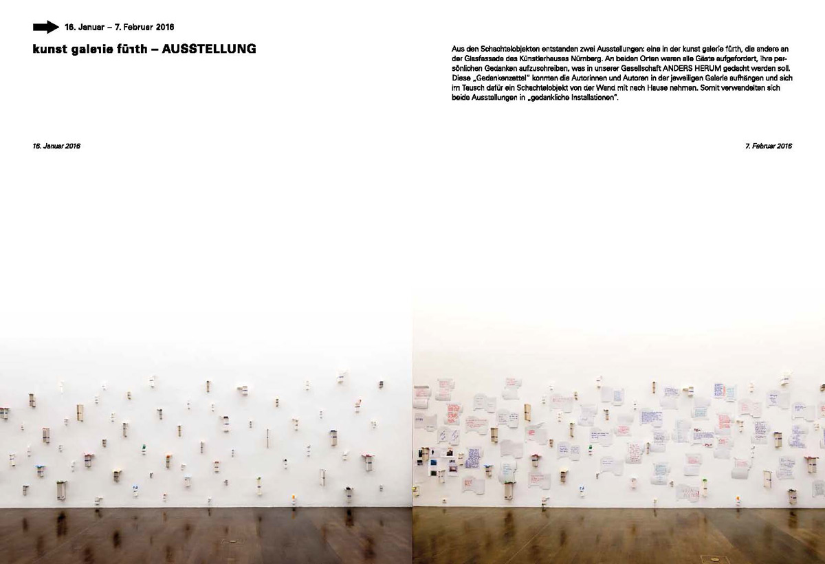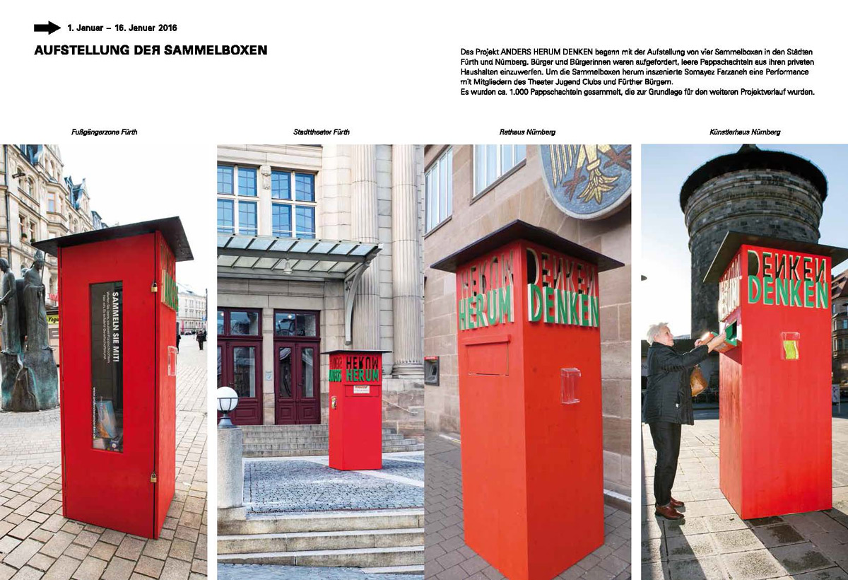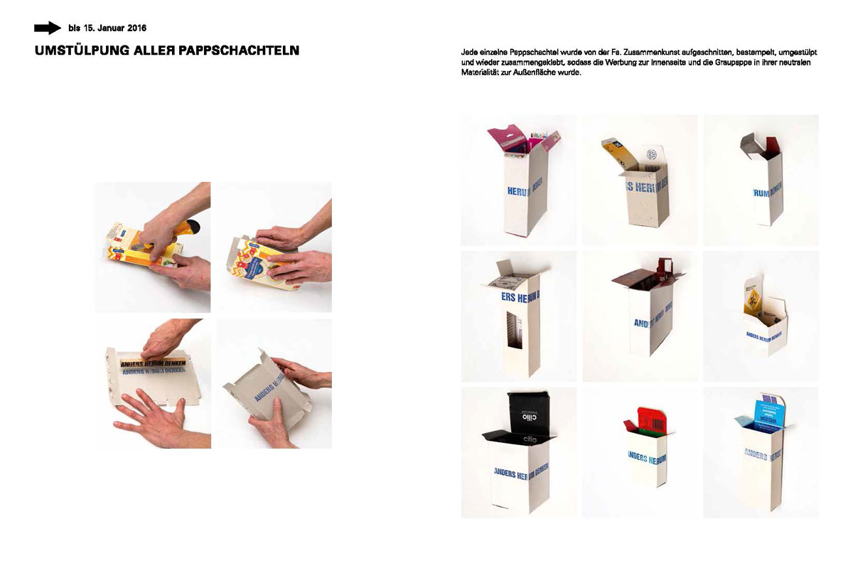 Das Projekt fragt nach: Was soll in unserer Gesellschaft andersherum gedacht werden? In einem städteübergreifenden Prozess in Nürnberg und Fürth waren alle Bürgerinnen und Bürger eingeladen, sich zu beteiligen. Aus gesammelten, leeren Pappschachteln enstand eine Installation in der kunst galerie fürth und parallel im Künstlerhaus Nürnberg.