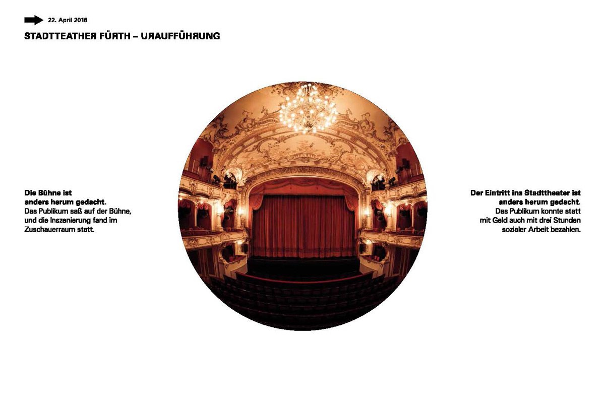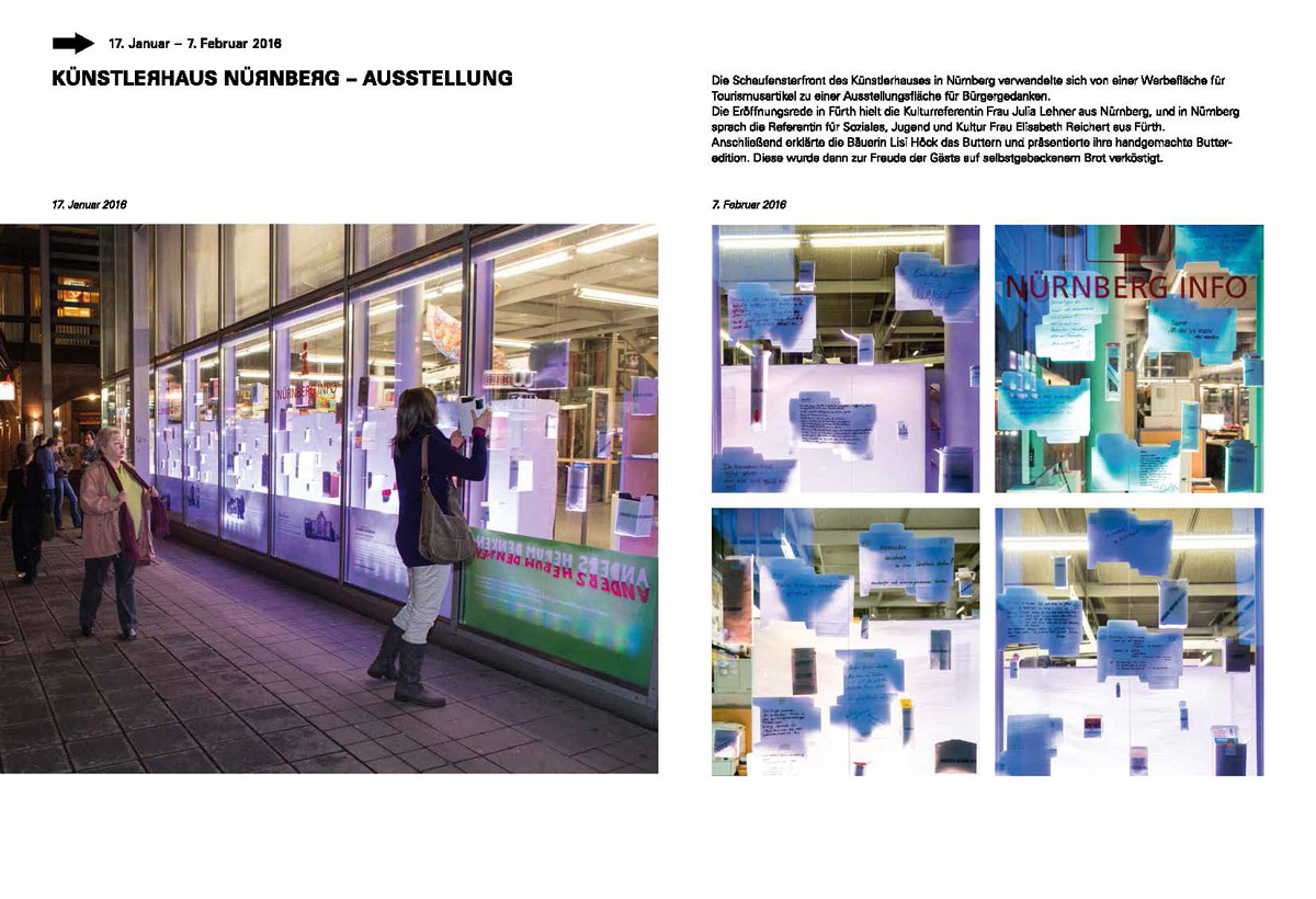 Ein Projekt zwischen Bürgerbeteiligung und festgelegtem Konzept in Einbindung der Städte Fürth und Nürnberg, in Kooperation mit dem Stadttheater Fürth, der kunst galerie fürth, dem KunstKulturQuartier Nürnberg, dem Papiertheater Nürnberg... initiiert von der Fa. Zusammenkunst.