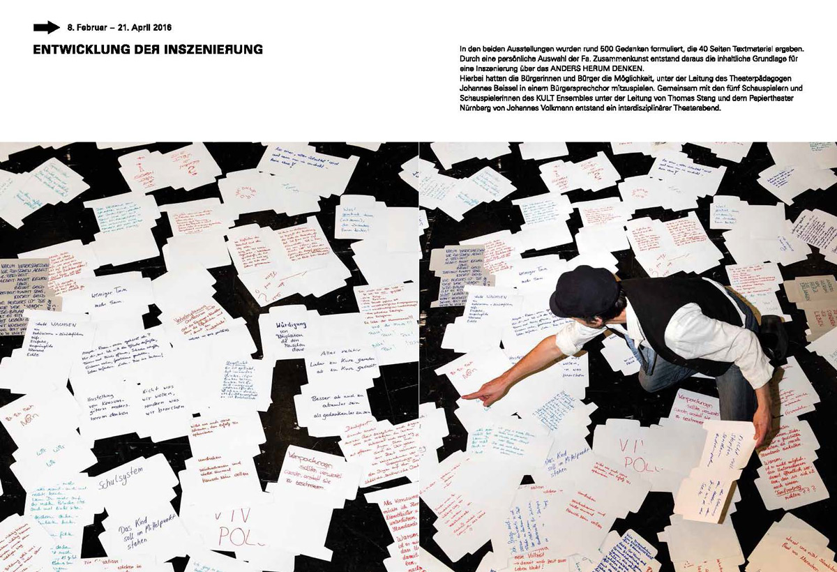 Aus beiden Installationen entstand zwei Monate später eine Inszenierung im Stadttheater Fürth, bei der Bürgerinnen und Bürger gemeinsam mit 5 Schauspielern und dem Papiertheater mitspielen konnten. Aus der Inszenierung entwickelt sich derzeit die Idee eines offenen Forums für Ideen und Experimente zum: ANDERS HANDELN.