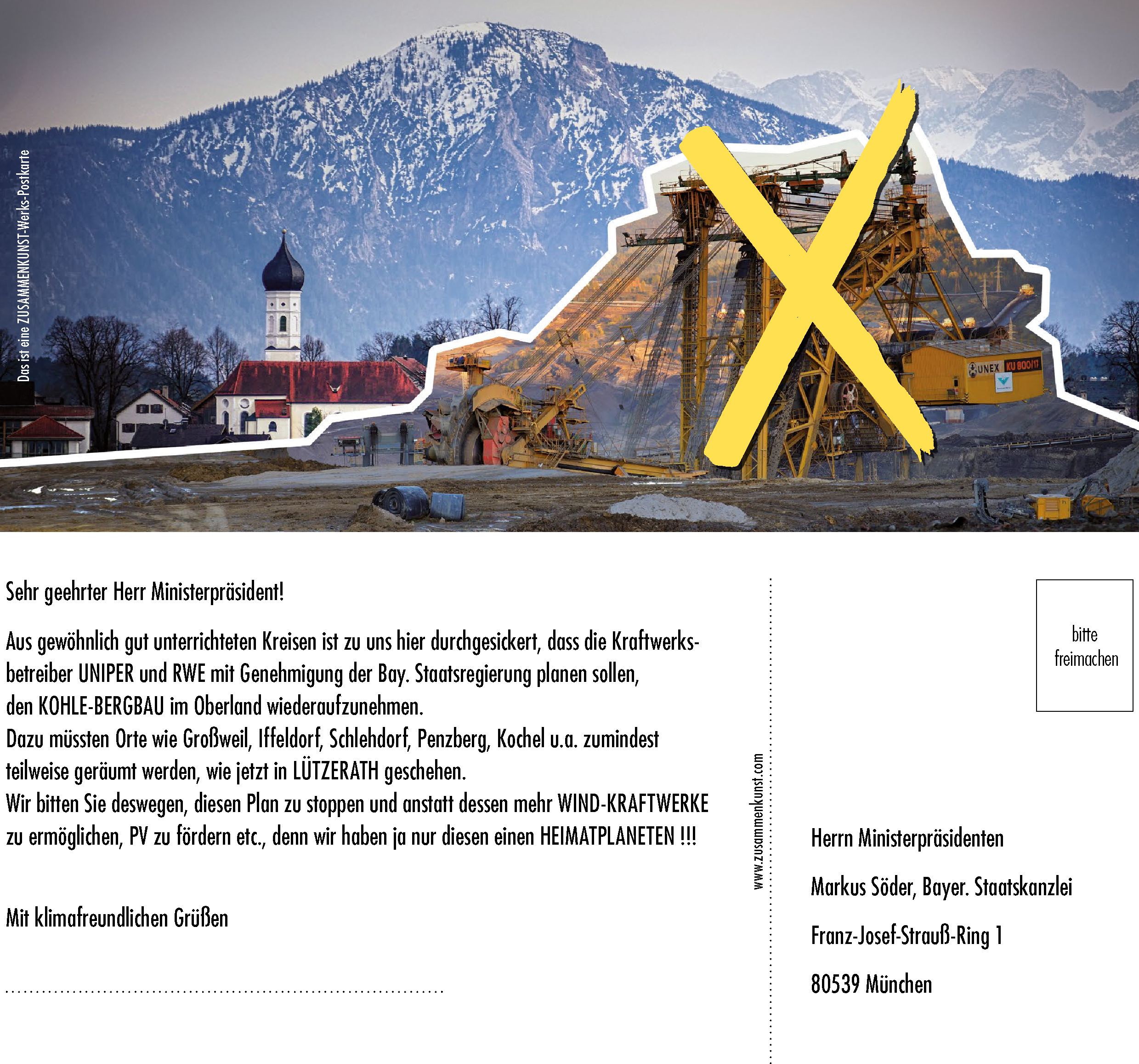 Die Auseinandersetzungen um den Erhalt bzw. die Räumung des Dorfes Lützerath mit der Diskussion um die Sinnigkeit von Kohle-Abbau im Zeichen der Klimakatastrophe, waren für den Künstler, der selbst hier im Oberland wohnt, der konkrete Anlass, auch hier für die Thematik zu sensibilisieren.