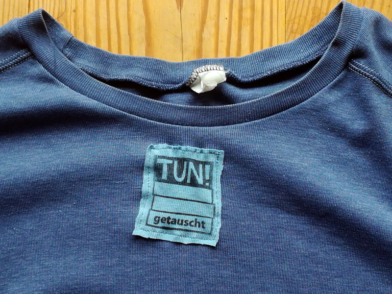 Tauschen Sie Ihre nicht mehr getragenen Kleidungsstücke mit anderen und nähen Sie das TUN! – getauscht-Label auf ihr Kleidungsstück. Jeder kann das Label dann sehen und will dann auch ein TUN!-getauschtes Kleidungsstück haben. Ein neuer Kreislauf entsteht.